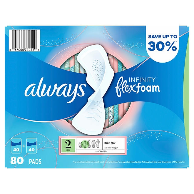 Always Infinity FlexFoam Heavy Flow Pads with Flexi-Wings, Unscented, Size 2, 80 ct.