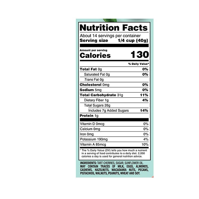 Dried cherries have a surprising amount of rich, nutritional benefits and are fortified with antioxidants and vitamins that support your health. Plentiful in vitamin C, and B complex, vitamin A and potassium. Studies show the antioxidants in cherries may also relieve pain and improve bone strength. Reduce inflammation by eating Montmorency tart cherries. Promote a natural better sleep by eating a handful of dried cherries before bed.
