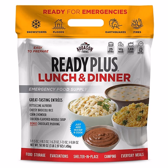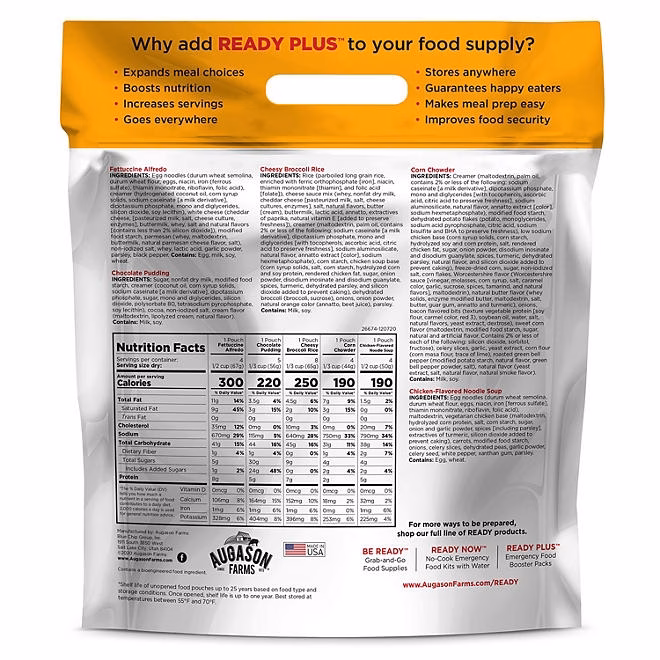 Give your emergency food supply a boost with an Augason Farms READY PLUS&trade Lunch and Dinner emergency food pouch. You’ll have an additional 5,820 calories and 141 grams of protein to add to your supply of survival food, which helps improve your self-sufficiency and food security in a crisis. Extra calories and protein are essential if you are highly active and burn above-average calories or if an emergency lasts longer than expected.