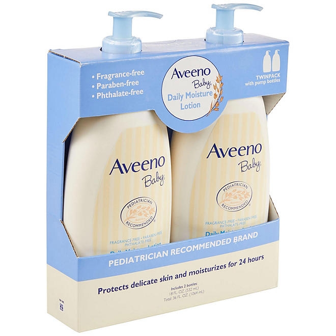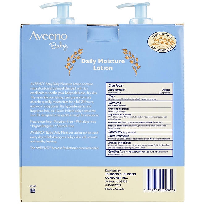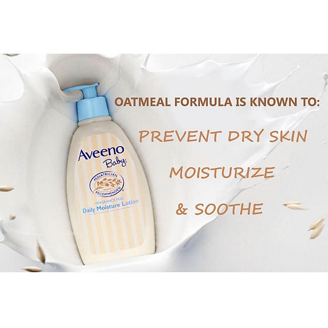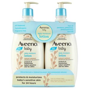 This product is a bottle of Aveeno Baby Daily Moisture Body Lotion with natural colloidal oatmeal and rich emollients. The naturally nourishing formula of this oatmeal baby lotion moisturizes for a full 24 hours. It is specially formulated to be gentle enough for daily use. This oatmeal baby lotion with natural colloidal oatmeal and dimethicone prevents and protects dry skin.