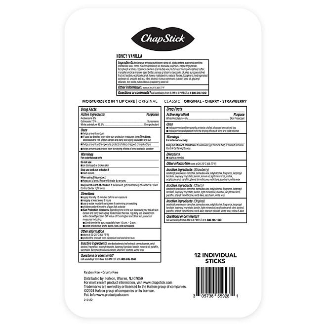 This convenient multi-pack includes 12 regular-size (0.15 ounce) tubes so you&rsquoll always have your favorite lip balm on hand &ndash through every season, at home or on the go. Experience silky, soft lips with the ChapStick Honey Variety Pack, a must-have for lip care lovers.