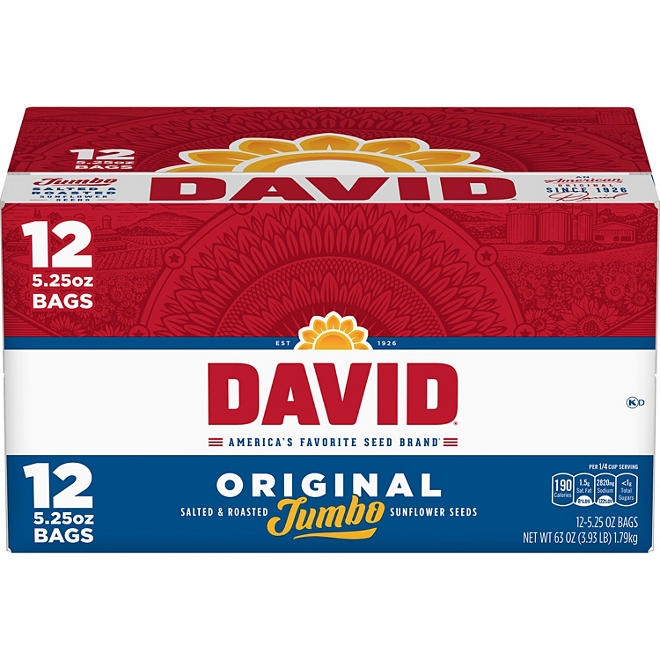 David Jumbo Sunflower Seeds (5.25 oz., 12 ct.) is an American favorite. Sunflower seeds are full of healthy fat, protein, fiber, vitamins and more. Each sunseed is roasted in its shell for a naturally delicious flavor. If you are searching for a healthy snack, David’s Sunflower Seeds are a great choice. David Jumbo Sunflower Seeds are fun to eat and good for your health.