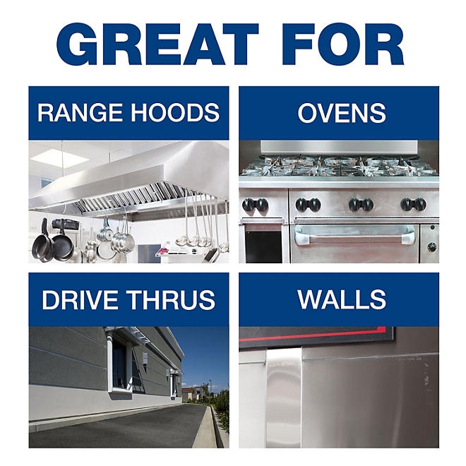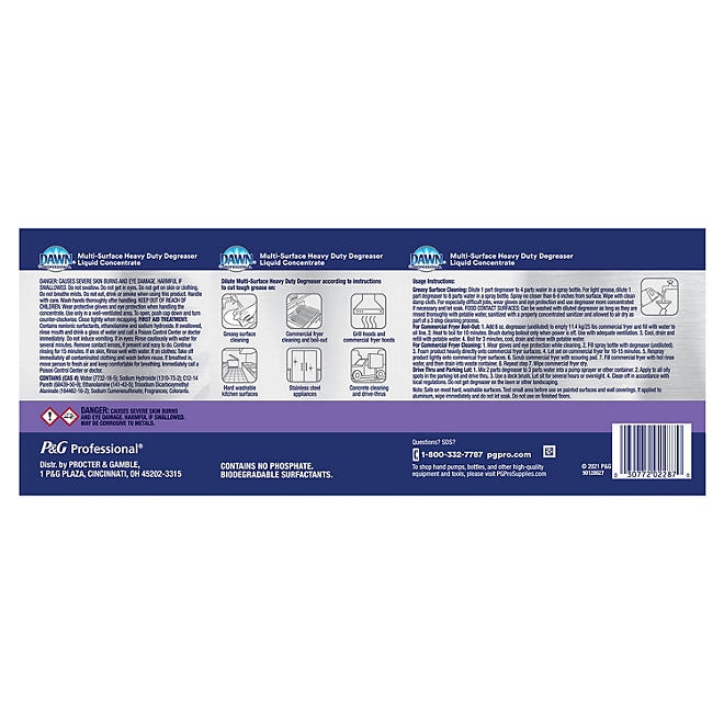 Dawn Professional Multi-Surface Heavy Duty Degreaser is designed to clean tough, greasy soils across multiple surfaces. It cleans heavy cooking grease/oil (polymerized animal grease) on various kitchen/foodservice surfaces such as range hoods, fryers, ovens, stainless steel appliances, walls, and other greasy hard surfaces. This product can also be used for fryer boil-out. In addition, it cleans greasy soils on exterior surfaces such as drive thru pads and concrete sidewalks.
