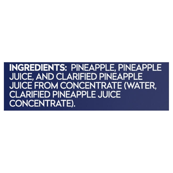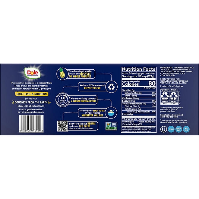 Dole Pineapple Chunks are packed in an easy-to-open can, keeping the cut pineapple fresh and ready to be enjoyed at any time. Rich in Vitamin C and made with no added sugar, Dole Pineapple Chunks in 100% Pineapple Juice are made with the nutritional goodness of real fruit, making them the ideal snack for breakfast, lunch, dinner, or anytime you’re craving a sweet treat. Dole Pineapple Chunks are great by themselves, as a topping, or in fruit salads, smoothies, or homemade desserts. Add them to skewers, stir fries, or pizza. With Dole’s shelf-stable products, you can have the delicious taste of refreshing fruit anywhere, anytime.