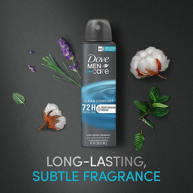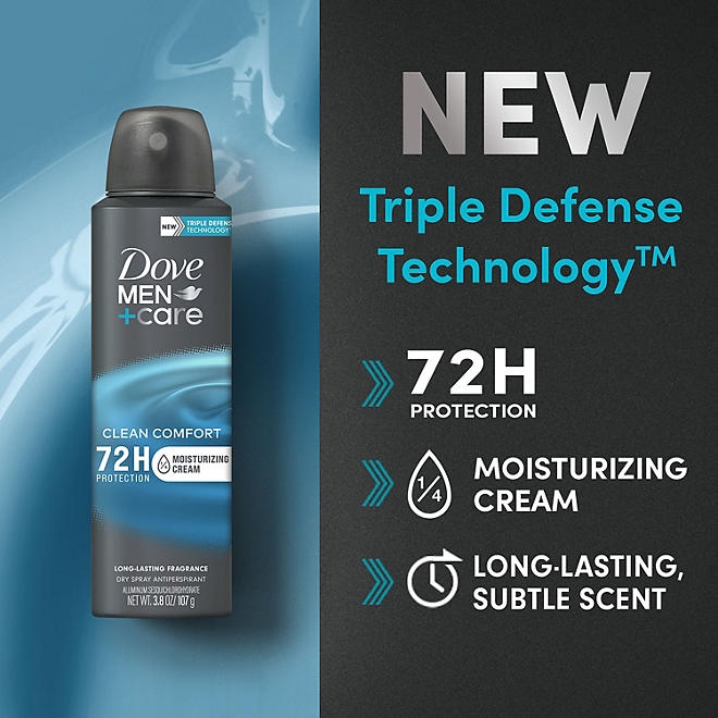 Introducing the Dove Men+Care Clean Comfort Antiperspirant Dry Spray, your new go-to for all-day freshness. This 3 pack makes it convenient to keep a can at home, in your backpack, sports bag, desk drawer or locker. Dermatologist tested, this dry spray gives you the confidence you need to face the day, wherever you are.