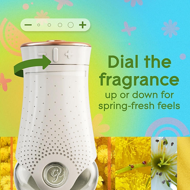 Spring into a refreshing experience with sleek Glade PlugIns Scented Oil Air Freshener with MaxControl Technology with Limited Edition Radiant Bloom fragrance. Unlock springtime bliss with these masterfully crafted fragrance oils made without phthalates, parabens, formaldehyde or nitro musks. This limited edition scented oil is a great way to bring springtime vibes to any gathering with spring scents and an inviting fragrance. Add a defining flair to any space with the Glade Radiant Bloom PlugIn Scented Oil which encapsulates the unique and vibrant energy of marigolds, pear blossoms and the mimosa plant.