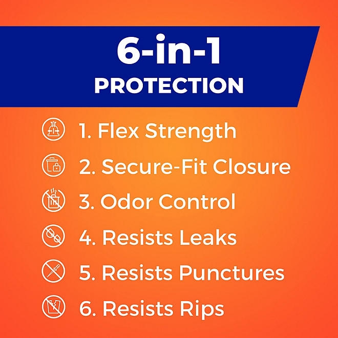 Trust Hefty Ultra Strong Tall Kitchen Drawstring Trash Bags to keep your kitchen waste contained&mdashall the way from can to curb. These 13-gallon drawstring trash bags provide a 6-in-1 protection including flex strength, secure-fit closure, odor control, and resists leaks, punctures, and rips. That stretchy strength means you don’t have to worry about unexpected bag breakage and inconvenient messes.
