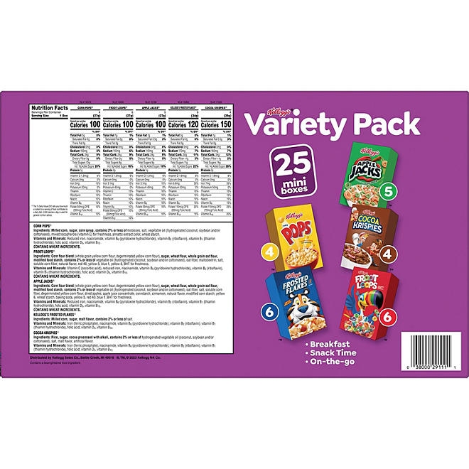A sweet, crispy, crunchy way to start your day, Kellogg’s Cereals make for a delicious cold breakfast any morning of the week. Featuring five tasty cereals, the Kellogg’s Cereal Variety Pack is a good source of at least seven vitamins and minerals. Individually sized and conveniently packaged, these delicious cereals are an ideal companion for lunch boxes, after-school snacks, and busy, on-the-go moments. Just add your favorite dairy or nut-milk or enjoy as a crispy treat straight from the miniature box. This variety pack contains your choice of Corn Pops, Froot Loops, Apple Jacks, Kellogg’s Frosted Flakes, and Cocoa Krispies.