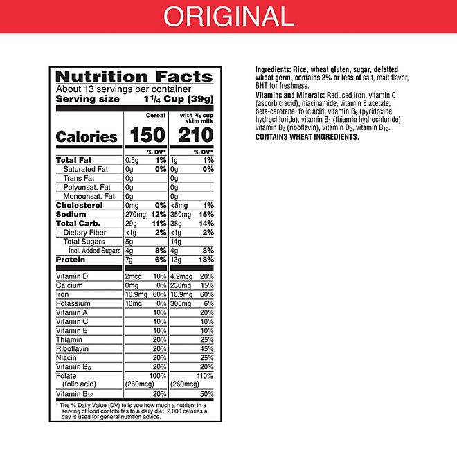 Special K is as nutritious as it is delicious. Each bowl serves as a good source of 11 essential vitamins and minerals. It contains folic acid, B Vitamins, and Iron, along with Vitamins A, C, and E, which act as antioxidants. Specially formulated with beta-carotene (a source of vitamin A), this cereal is designed to meet the nutritional needs of women.