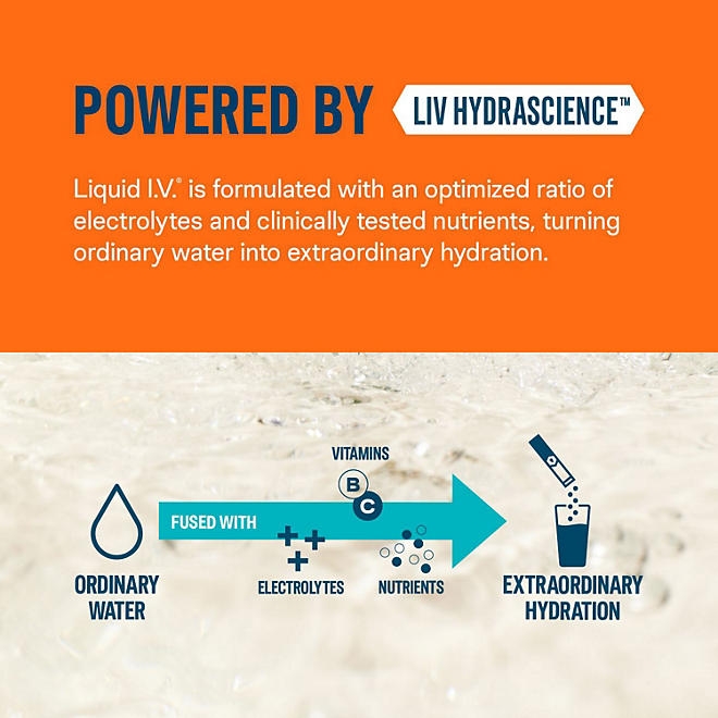 Liquid I.V. products are powered by LIV HYDRASCIENCE&trade, a unique technology that delivers hydration faster than water alone. Our formula is scientifically designed with an optimized ratio of electrolytes and clinically tested nutrients to transform ordinary water into extraordinary hydration. It’s specifically formulated to quickly replenish electrolytes and fluids lost from sweat or exercise, making it an ideal choice for athletes and fitness enthusiasts.