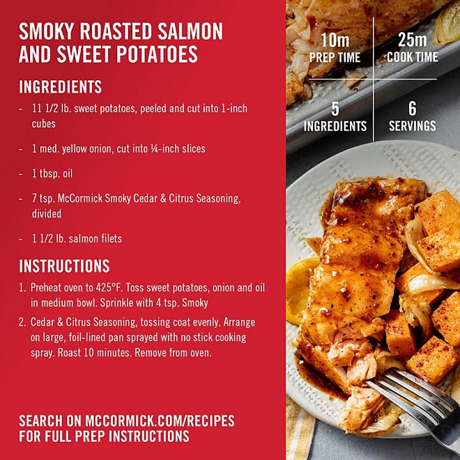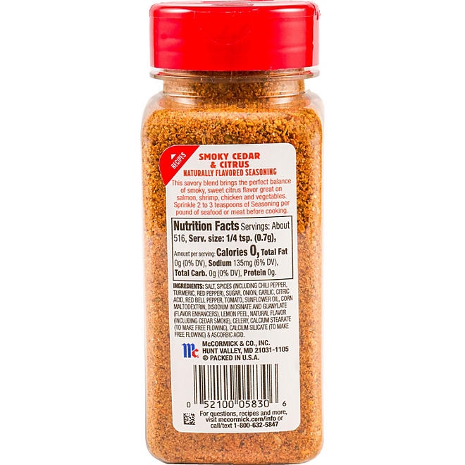 Made with a blend of ingredients including salt, chili pepper, turmeric, red pepper, onion, and garlic, McCormick Smoky Cedar & Citrus Naturally Flavored Seasoning is the perfect addition to your roasted vegetables such as broccoli, carrots, or potato wedges. It also makes an excellent rub for shrimp or salmon before grilling, or combine with oil for a quick and tasty marinade for grilled or roasted chicken. To use, simply sprinkle 2-3 tsp per lb of seafood or meat before cooking.