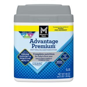 Compare to the nutrition of Similac Pro-Advance Infant Formula. Crafted to be closer to breast milk, Member’s Mark Advantage Premium Infant Formula Milk-Based Powder with Iron provides complete nutrition for babies 0-12 months. HMOs are immune supporting prebiotics commonly found in breast milk, and the dual HMOs in this baby formula, LNnT and 2&rsquo-FL, support immune system and digestive health by aiding the growth of beneficial bacteria in baby’s digestive tract. DHA, Lutein and Vitamin E are included for brain and eye development. To help promote calcium absorption for strong bones, this formula does not contain palm olein oil.