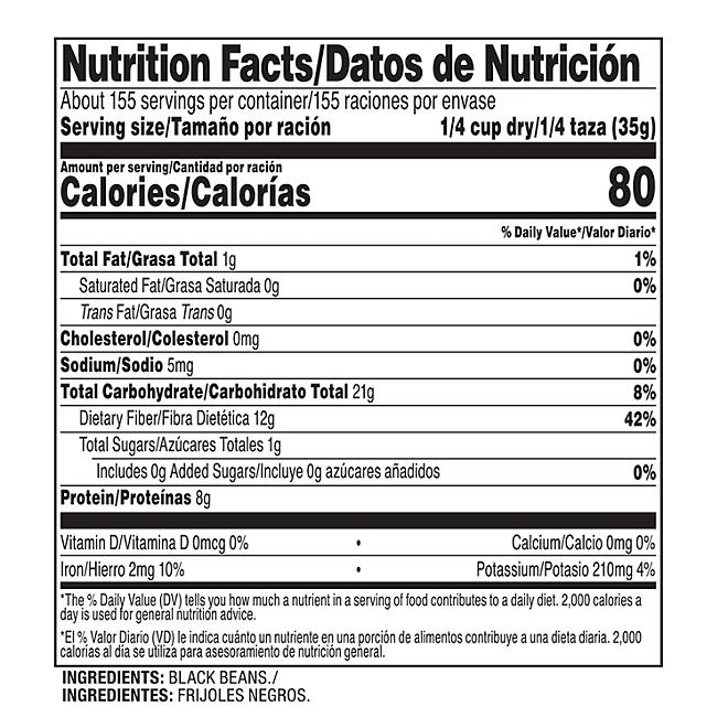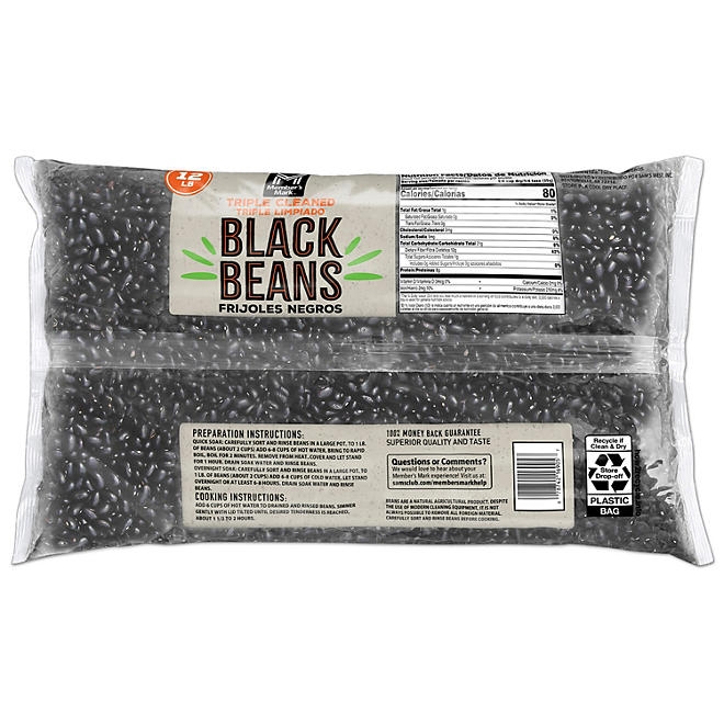 Perfect for both home and commercial kitchens, Member’s Mark Black Beans (12 lbs.) are easy to prepare and packed with protein and fiber. Great in salads, soups and burritos, these black beans are kosher, fat-free and gluten-free. This plant based protein is nutrient-dense and can be stored in an air tight container for up to 2 years. Member’s Mark Black Beans can be added to eggs, salsa, dips, spreads, baked potatoes, and chili. Beans must be soaked before cooking. Soaking and cooking directions can be found on the back of the package.&nbsp