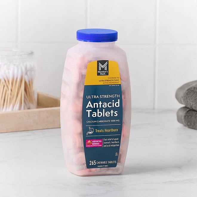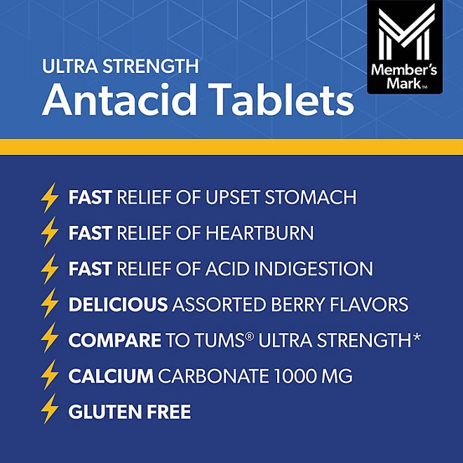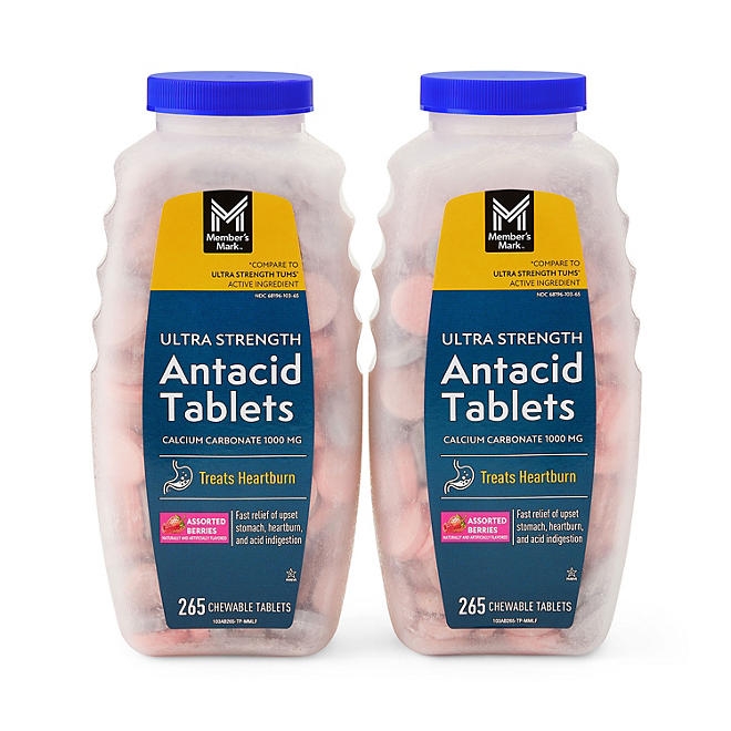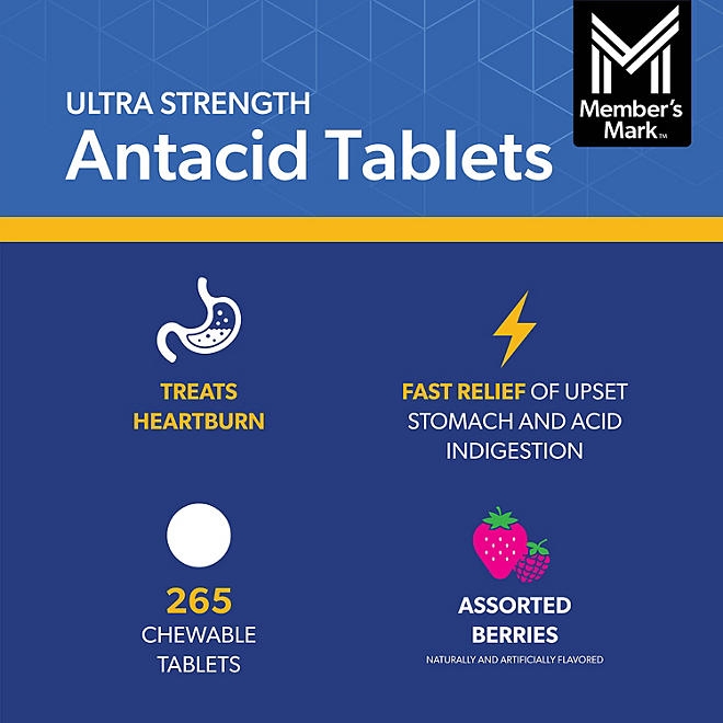 Member’s Mark Ultra-Strength Antacid Tablets are easy-to-take assorted berry chewable tablets that provide maximum relief of your toughest heartburn.