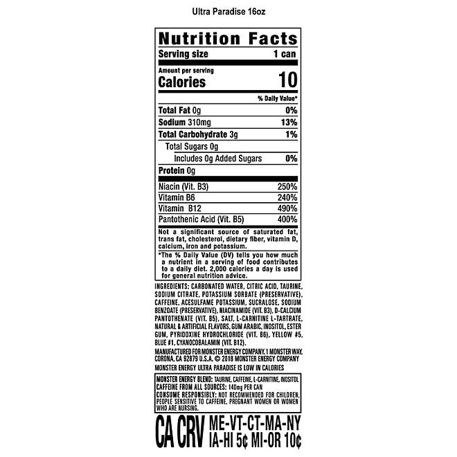 For those looking for a Monster that is lighter tasting, has zero sugar, and contains the full Monster Energy blend, Monster Energy Ultra Paradise is available in a convenient pack of 24. Due to new FDA nutrition labeling requirements, product labels may vary from those pictured. Monster Energy Ultra Paradise contains 150 mg of caffeine per can with 10 calories per can offering a low calorie, zero sugar energy drink. Does not contain any of the eight major allergens. UNLEASH THE BEAST!