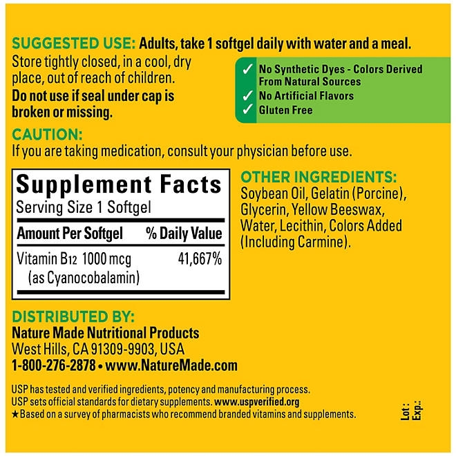 Adults take one of these Nature Made B12 softgels daily with water and a meal. Nature Made supplements are quality you can trust. USP has tested and verified ingredients, potency and manufacturing process. USP sets official standards for dietary supplements. Visit the USP verified website for more information. (1)Helps convert food into cellular energy. (2)Adequate Vitamin B12 status helps support a healthy mood. *Based on a survey of pharmacists who recommend branded vitamins and supplements.