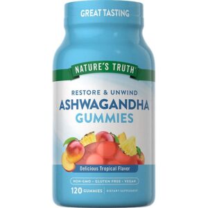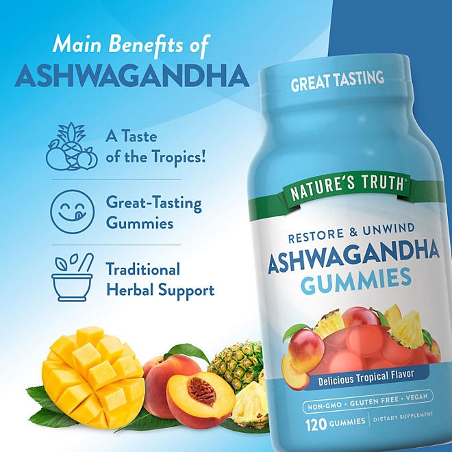 Restore, unwind, and appreciate adding concentrated herbal support to your day Nature&rsquos Truth Ashwagandha Gummies. Each delicious natural tropical-flavored gummy delivers the equivalent of 500 mg. of premium Ashwagandha Root.* No hint of an herbal aftertaste&mdashjust great flavor!