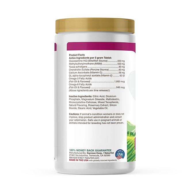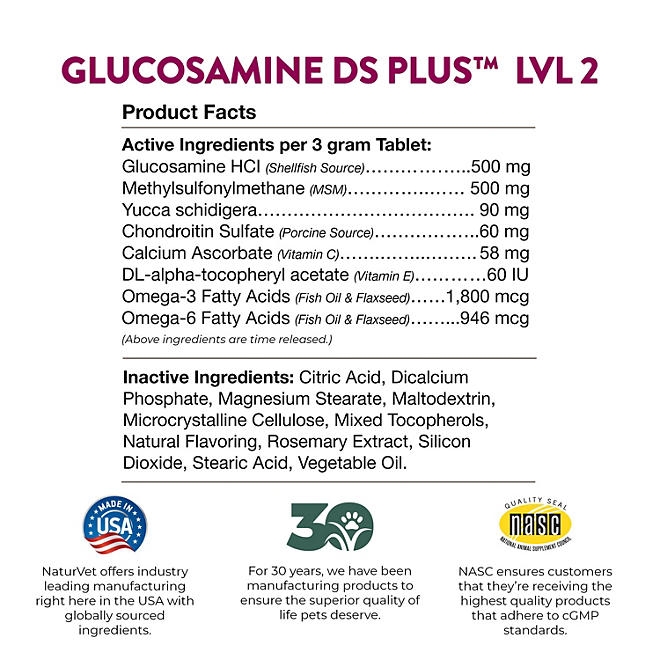 • NaturVet, Glucosamine-DS Plus Level 2 Time Release Tablets for Dogs or Cats, 240ct, supplement for dogs and cats 12 weeks and older that support joints and mobility