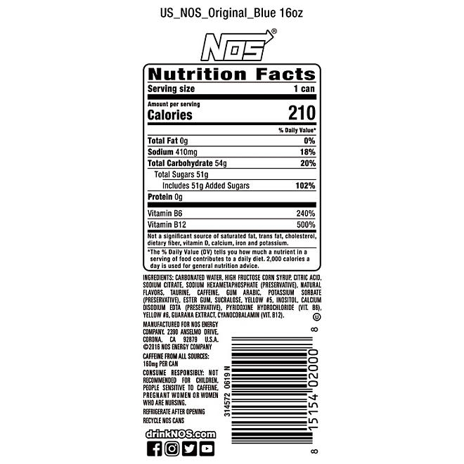 Those other guys sell tiny little shots or cans of soda pop that contain a little bit of caffeine. NOS High Performance Energy Drink delivers a serious energy boost in a delicious, thirst-quenching beverage that you can enjoy anytime you feel the need. NOS High Performance Energy Drinks contain natural caffeine, taurine, guarana, B6, B12 and L-theanine.How Many Cans of NOS High Performance Energy Drink Will You Get?