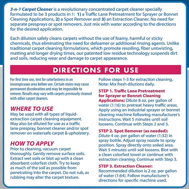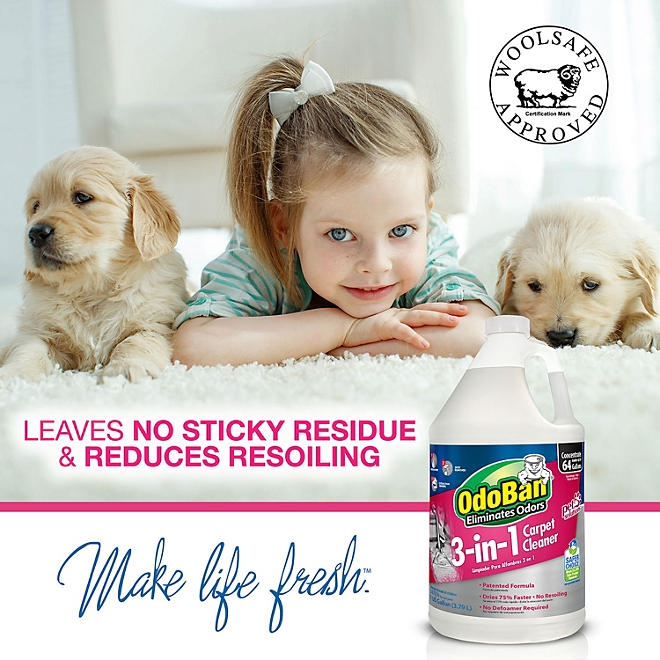 OdoBan 3-in-1 Carpet Cleaner is a concentrated carpet cleaning solution that uses safer ingredients to effectively deep clean carpets. Works as three products in one: a traffic lane pretreatment, extraction cleaner and spot remover. Cleans carpet without the use of foamy, harmful or sticky chemicals. This product’s patented formula technology reduces wear and tear to carpets by suspending dirt and soils, drying 75% faster than traditional carpet cleaners. This unique formula eliminates the need for separate pre-sprays, spot removers, defoamers or additional rinsing agents. Does not promote resoiling, fiber untwisting or matting. Use as a carpet extraction cleaner solution, safe for use in all carpet cleaning machines. OdoBan 3-in-1 Carpet Cleaner is independently tested and WoolSafe approved, so it is safe to use on wool carpet. This concentrated formula makes up to 64 gallons of carpet cleaning solution per gallon of product (up to 256 gallons per 4-Pack), just mix with water. This concentrated carpet cleaning solution is safe for use in all carpet cleaner machines, carpet steam cleaners and all types of liquid-extraction carpet cleaning equipment.