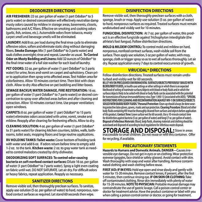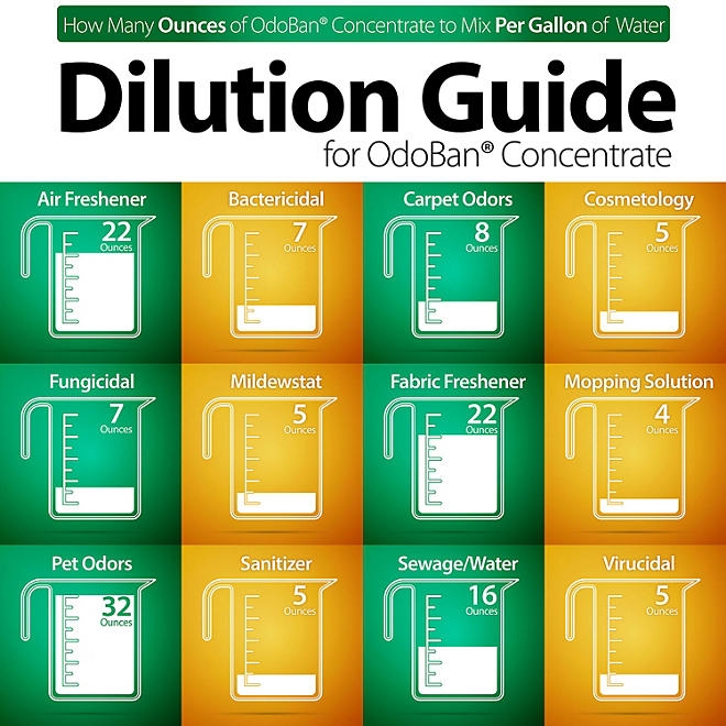 A little goes a long way! One gallon of OdoBan® concentrate makes up to 32 gallons of cleaning solution. Just mix with water as directed on the label.
