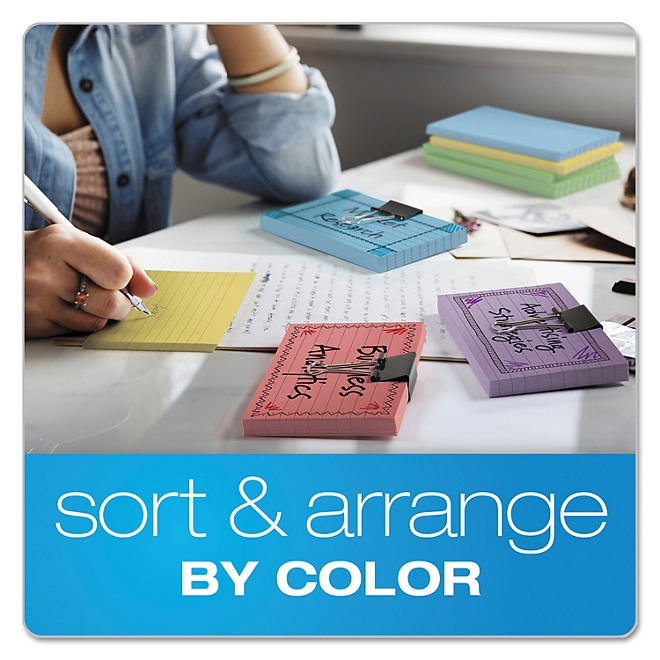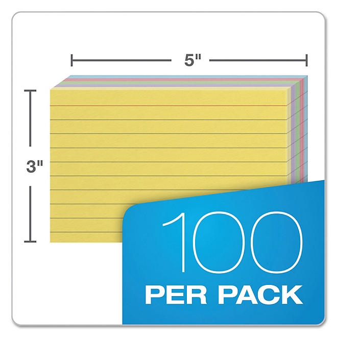 Start early and help students build good notetaking habits. Index cards can help organize chapter notes, plan writing or research assignments, bring order to talking points, create study cards for the SAT, ACT, NCLEX, EMT or MCAT exams, or keep track of a growing to do list. The ultimate life hack for successful study, kindergarten through college! Score points for neatness with a classic blue rule perfect for lists, recipes notes or facts & figures. These versatile cards are durable enough for most any assignment. Proudly made in the USA. 3″ x 5″. Assorted colors: blue, canary, cherry, green, violet. 100 Per pack. Card Quantity: 100 Card Size (H x W): 3 x 5 Color Assortment: Blue Canary Cherry Green Violet Color Family: Multicolor Color(s): Assorted Ruling: Ruled Post-Consumer Recycled Content Percent: 10%. Recycled Comments: Contains 10% post-consumer recycled content.