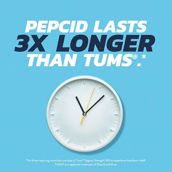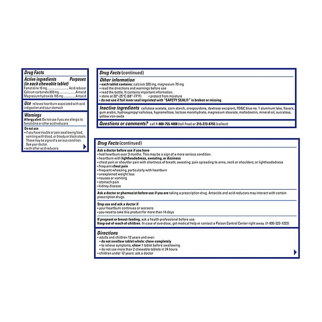 Pepcid tablets feature a powerful, fast-acting formula that helps to neutralize acid in seconds for immediate comfort. Additionally, they offer dual action by continuing to protect against heartburn for the next 8 hours, so there’s no concern for heartburn creeping back up. Pepcid chewable tablets contain effective active ingredients like 10mg of famotidine, as well as antacids like calcium carbonate and magnesium hydroxide, for powerful relief. It’s also unique because it combines antacids with an H2 acid reducer.