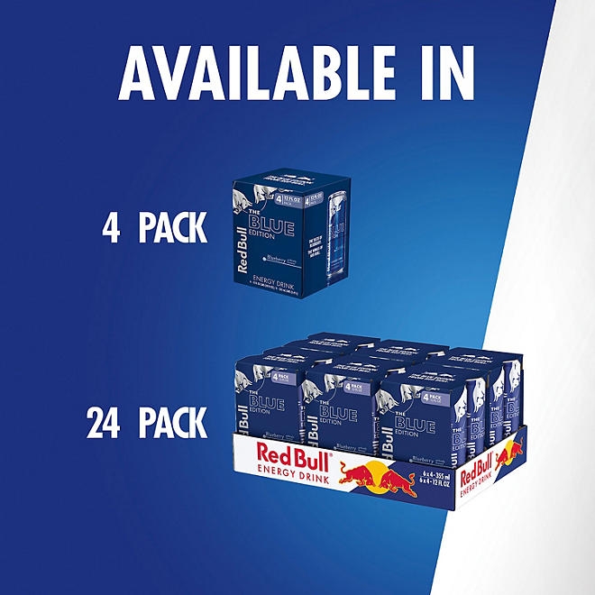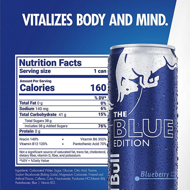 Red Bull Blue Edition is a carbonated beverage that combines the wings of a Red Bull Energy Drink with the bold taste of blueberry.WHEN TO DRINKRed Bull is a great energy drink to have by your side, and is appreciated throughout the world by top athletes and busy professionals to college students and travelers on long journeys. For those who need wings for intense meetings or creative brainstorming sessions, on the field with teammates or competitors, or simply want to get the most out of life, a chilled can of Red Bull Blue Edition gives you the wings you need.WHAT’S INSIDE THE CANCaffeine was well known for its stimulating effects by ancient civilizations who consumed it from natural sources like tea, coffee, cacao beans and cola nuts.Taurine is an amino acid, naturally occurring in the human body and present in commonly consumed foods. It is involved in a wide range of biological processes.B-Group Vitamins are essential micronutrients that are required for maintaining normal body functionsSucrose and Glucose are different types of sugars which are also contained in commonly consumed foods.Water, naturally, is a key ingredient of Red Bull.