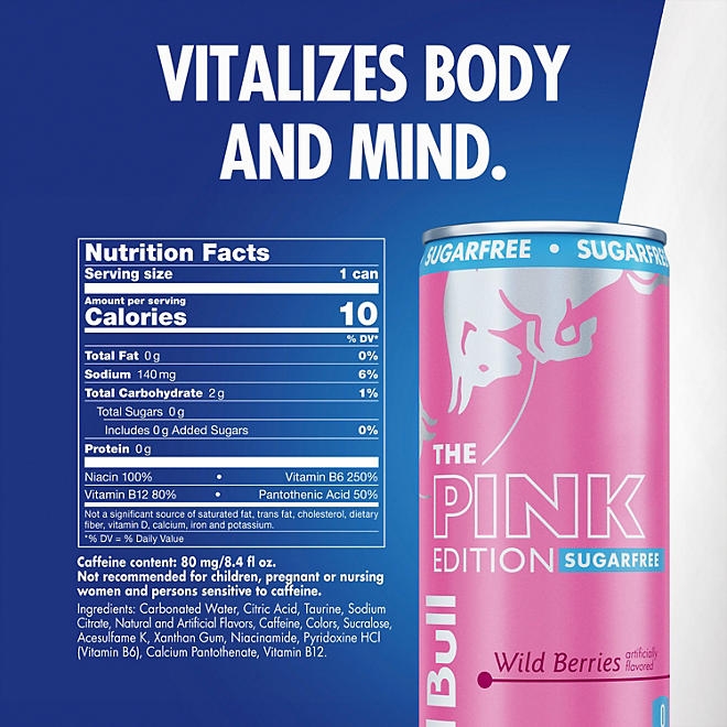 Red Bull Energy Drink contains caffeine, traditionally consumed from natural sources like tea, coffee, cacao beans and cola nuts for its stimulating effects on the human body. It also contains B-group vitamins, essential micronutrients required for maintaining normal body functions, and real sugars. Taurine, an amino acid naturally occurring in the human body and present in the daily diet, is also included. It is involved in a wide range of biological processes. Always check can labels.