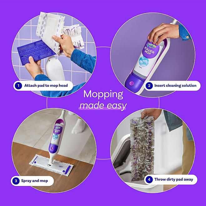 One PowerMop pad cleans up to 4X more floor! The all-in-one mopping system is also great for cleaning baseboards and lays flat so you can easily clean under furniture. Enjoy the ease of disposable mop pads &ndash just throw dirt and grime away and start with a clean, fresh pad every time. PowerMop is safe on wood and all finished floors§. Buy Swiffer worry-free. If you&rsquore not completely satisfied, check out our money-back guarantee.