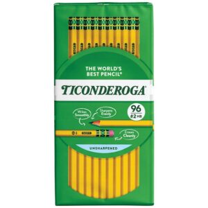 With this Dixon&reg Ticonderoga&reg Woodcase Pencil, HB #2, Yellow Barrel, 96ct. pack you really are receiving The World’s Best Pencil&trade. Ticonderoga pencils’ bulk are made of high-quality cedar that is smoothed to a satin finish for the most comfortable writing experience. A favorite among teachers, students and professionals, Ticonderoga pencils contain an exclusive graphite formula writing core that provides smooth, tug-free writing performance, while premium latex-free erasers allow for effortless, clean corrections.