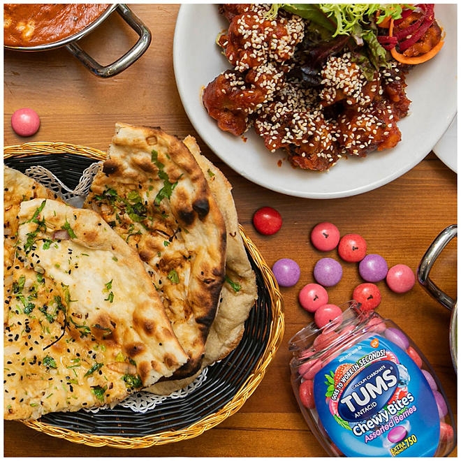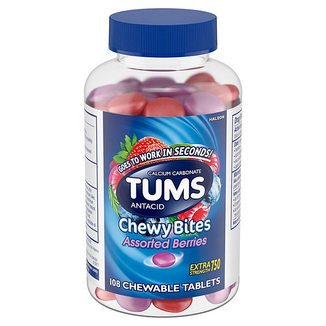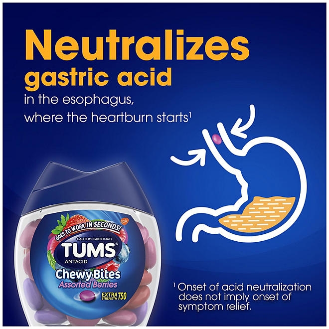 TUMS Chewy Bites Chewable Antacid Tablets provide quick and effective relief from heartburn. As soon as symptoms occur, you can take two to four chewable antacids, depending on the severity of your acid indigestion. Made with the active ingredient calcium carbonate, these chewable antacids alleviate heartburn, sour stomach, and acid indigestion, providing relief for upset stomachs associated with these symptoms.