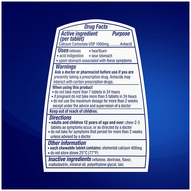 These 1000 mg antacid tablets are gluten-free and kosher, making them suitable for a wide range of dietary needs. Packaged in a resealable bottle, these tablets are convenient to keep in your car or office for whenever heartburn strikes. Choose TUMS Ultra Strength to fight flare ups fast, whether you’re at home or on the go.