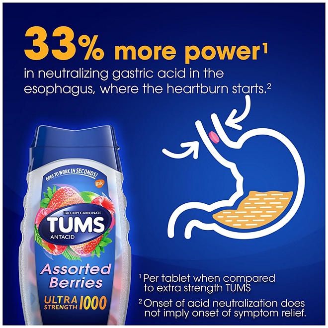TUMS Ultra Strength Chewable Antacid Tablets offer quick and potent ultra-strength relief from heartburn. These tablets start working in mere seconds, neutralizing acid on contact to alleviate discomfort. Depending on the severity of your acid indigestion, chew and swallow two to three ultra-strength tablets when symptoms occur.