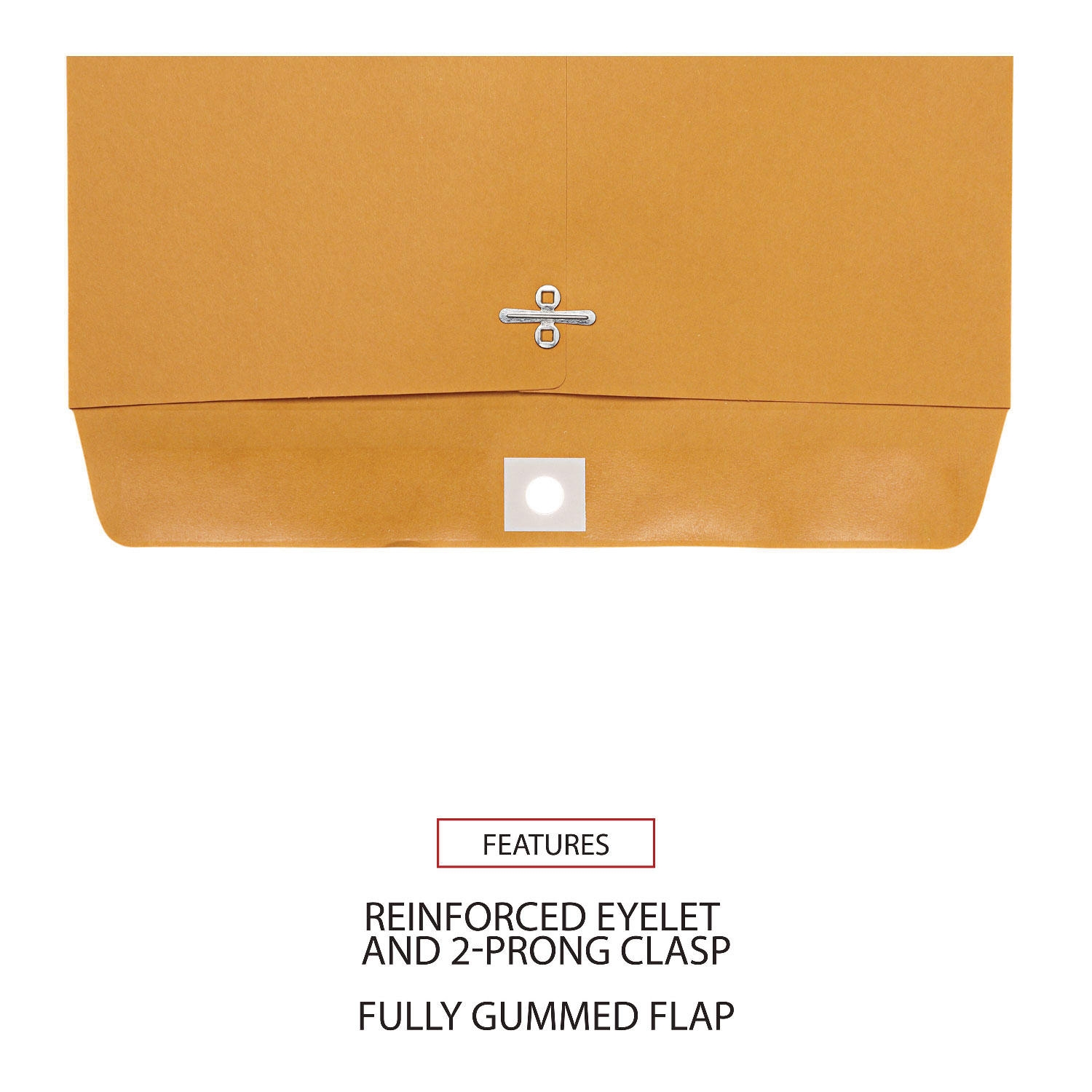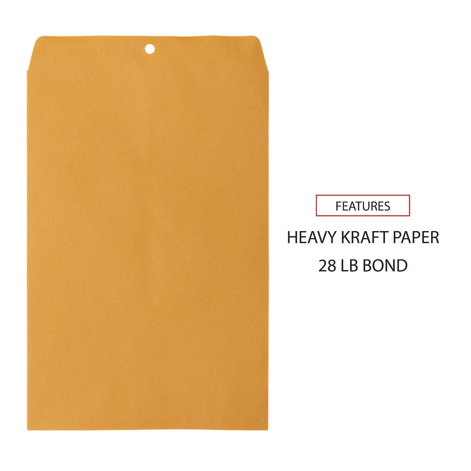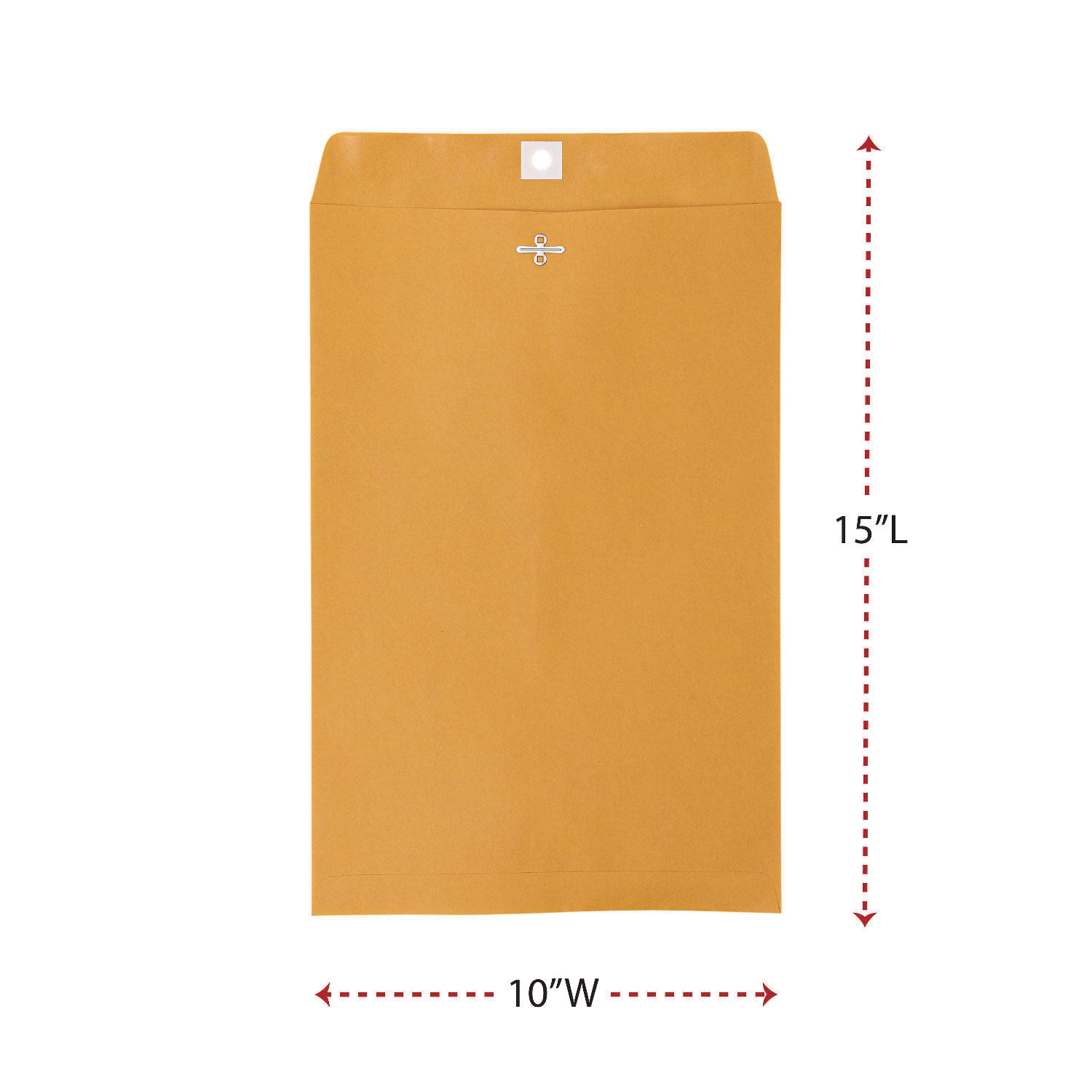 Durable heavyweight Kraft stock resists rips and tears. Reinforced eyelet and two prong clasp stands up to regular use Gummed flap delivers a secure seal. Envelope/Mailer Type: Catalog/Booklet Envelope Size: 10 x 15 Closure: Clasp/Gummed Trade Size: #98.