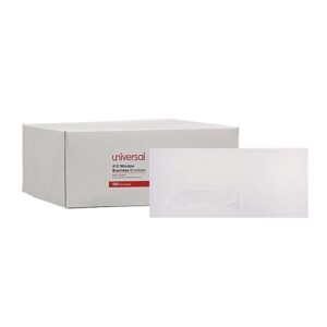 Universal® #10 window envelopes with gummed closure are the perfect business envelope for high volume mailings. The gummed closure can be moistened with a pad or licked closed. Simply stuff the envelope with your materials and wet the back the gummed strip on the back of the envelope flap, fold, and press the flap to close. The fully gummed flap ensures a secure seal across the envelope&rsquos width to prevent opening. Business-weight, 24 lb stock gives this envelope a professional feel. The envelope is also resistant to tearing and splitting great for mailing thicker documents. Wove finish provides a crisp appearance.