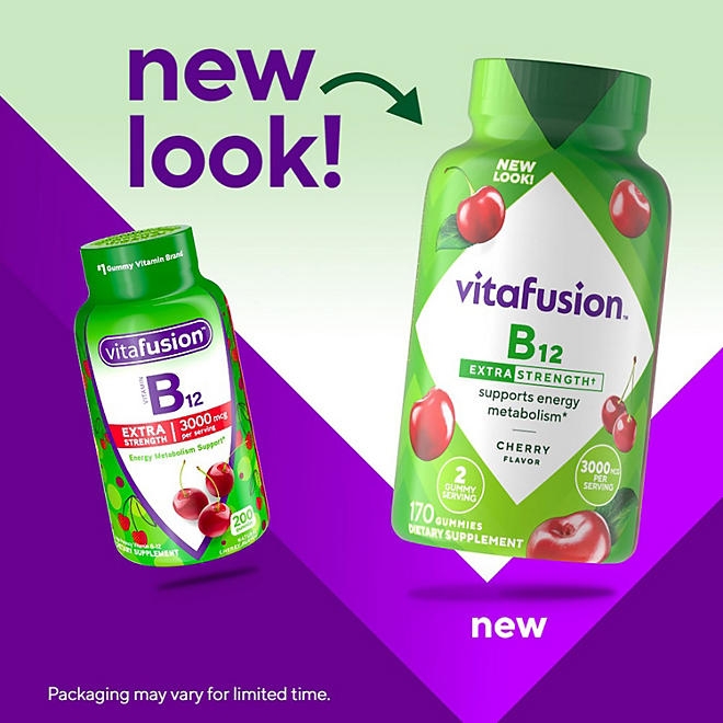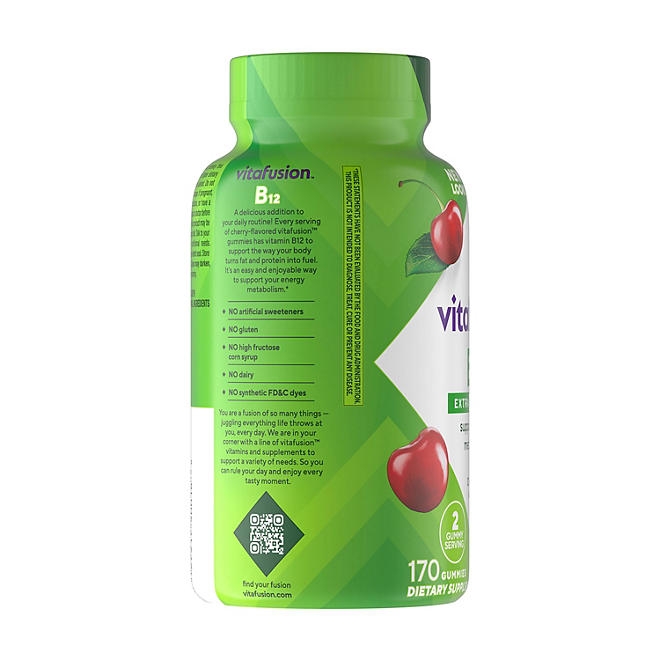 Vitafusion Extra Strength B12 gummy vitamins, 170 ct. fuse delicious and nutritious. Two Extra Strength B12 gummies provide 3000 mcg – 125000% daily value – of B12. Vitamin B12 is an essential component for red blood cell formation and helps support energy metabolism and nervous system health. Vitamin B12 also helps convert food to energy. Vitafusion Extra Strength B12 Gummy Vitamins contain no high fructose corn syrup, no artificial sweeteners, no gluten, no dairy, and no synthetic dyes.&nbsp