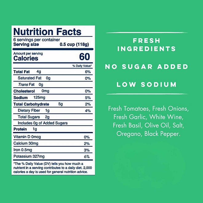 • Tomato basil pasta sauce cooked in small batches to preserve taste and freshness